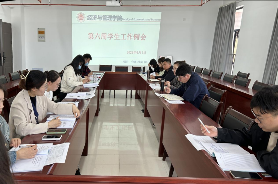 2024年4月1日中午,经济与管理学院在行政楼725办公室召开本学期第六周学生管理工作例会,副院长秦品德、书记助理叶赵强、院长助理张珊以及全体辅导员参加会议,会议由吴玲院长主持。