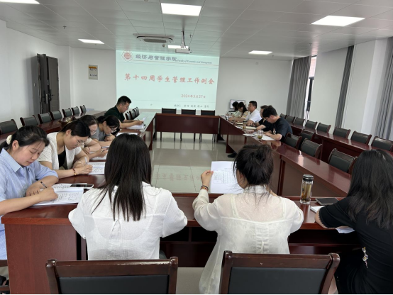 2024年5月27日,经济与管理学院在行政楼725会议室召开本学期第十四周学生管理工作例会,副院长秦品德、院长助理张珊、书记助理叶赵强以及全体辅导员参加会议,会议由院长吴玲主持。