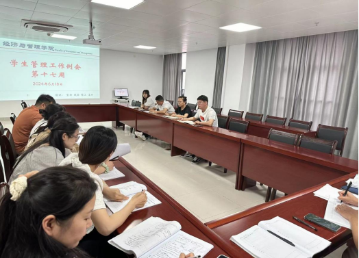 2024年6月18日,经济与管理学院在行政楼725会议室召开本学期第十七周学生管理工作例会,副院长秦品德、书记助理叶赵强以及全体辅导员参加会议,会议由院长吴玲主持。