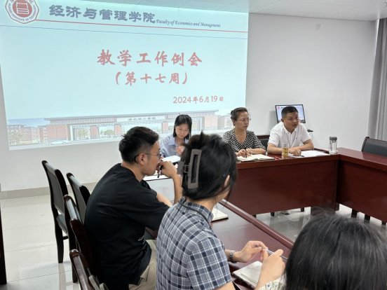 2024年6月19日下午,经济与管理学院在行政楼725会议室召开经济与管理学院第十七周工作例会,院长吴玲主持会议,副院长秦品德、院长助理张珊以及全体教师参会。