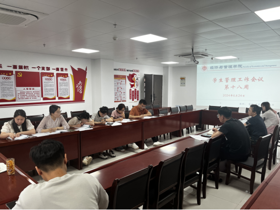 2024年6月24日下午,经济与管理学院在行政楼725会议室召开经济与管理学院第十八周工作例会,书记助理叶赵强、副书记助理员禹辛以及全体辅导员参加会议,会议由院长吴玲主持。