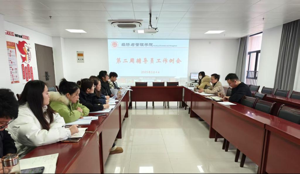 2025年3月4日,经济与管理学院在行政楼725会议室召开了本学期开学第二周的学生管理工作例会。学院书记助理员禹辛、团总支书记王绎程及全体辅导员参会,会议由院长吴玲主持。