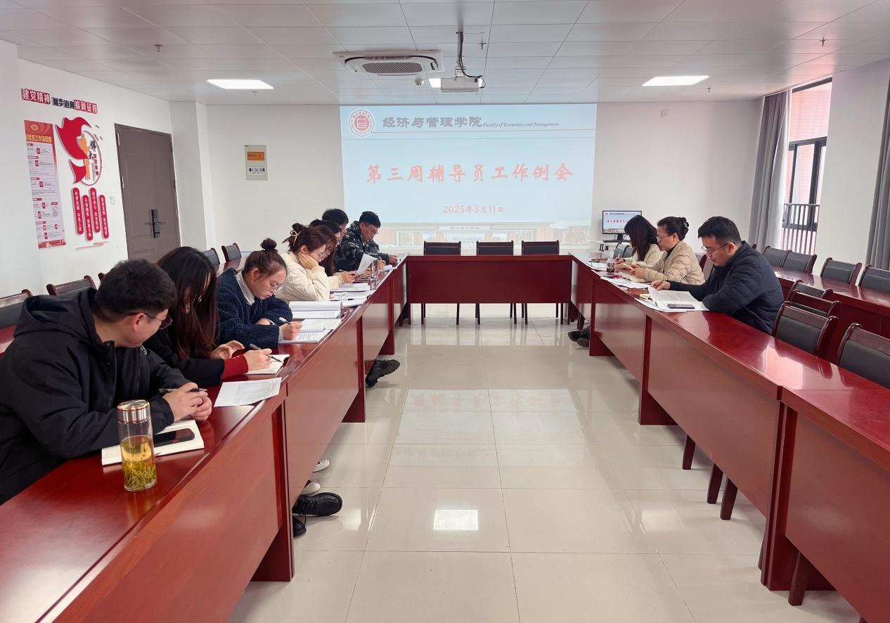 2025年3月11日,经济与管理学院在行政楼725会议室召开了本学期开学第三周的学生管理工作例会。学院书记助理员禹辛、团总支书记王绎程及全体辅导员参会,会议由院长吴玲主持。