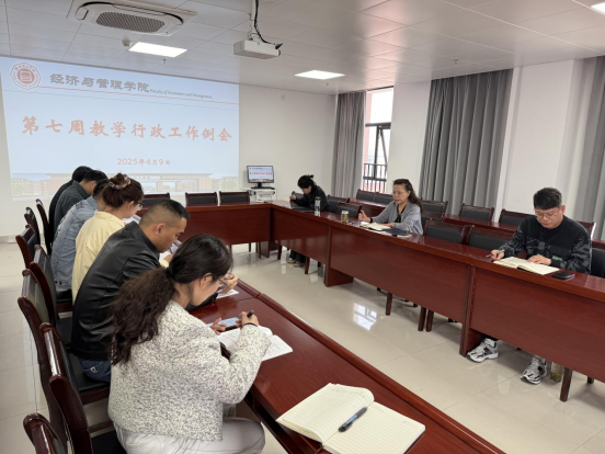 2025年4月9日,经济与管理学院在行政楼725召开第七周行政工作例会,院长吴玲、院长助理张珊、叶赵强实训室主任李健及各教研室主任出席会议。