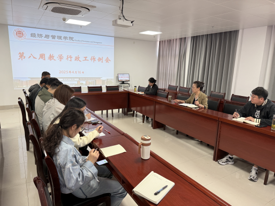 2025年4月16日,经济与管理学院在行政楼725召开第八周行政工作例会,院长助理张珊、叶赵强,教学秘书李健及各教研室主任出席会议,会议由院长吴玲主持。