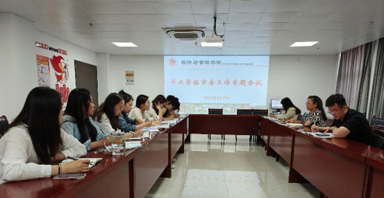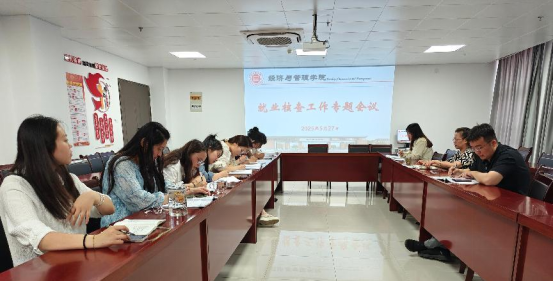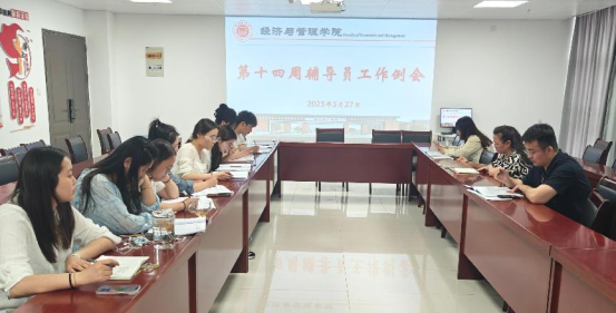 2025 年 5 月 27 日上午,经济与管理学院在行政楼 725 会议室召开了本学期第十四周学生管理工作例会暨就业核查工作专题会议及毕业资格审查工作专题会议。学院书记助理员禹辛、团总支书记王绎程及全体辅导员参会,会议由院长吴玲主持。