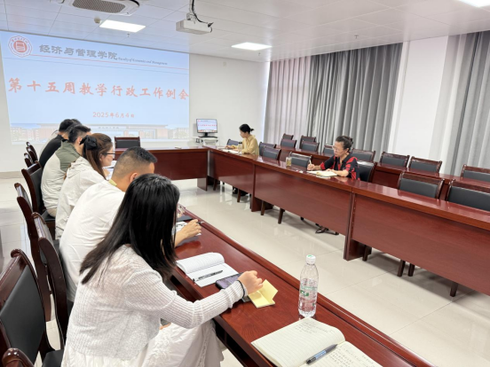 2025年6月4日上午,经济与管理学院在行政楼725会议室召开第十五周行政工作例会,院长助理张珊、实训室主任李健及各教研室主任参会,会议由院长吴玲主持。