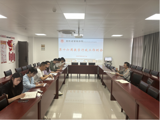 2025年6月11日上午,经济与管理学院在行政楼725会议室召开第十六周行政工作例会,院长助理叶赵强、实训室主任李健及各教研室主任参会,会议由院长吴玲主持。