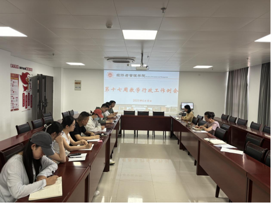2025年6 月 18 日,经济与管理学院召开第十七周工作例会,院长吴玲,院长助理张珊、叶赵强,教学秘书李健及各教研室主任参会,会议由院长吴玲主持。