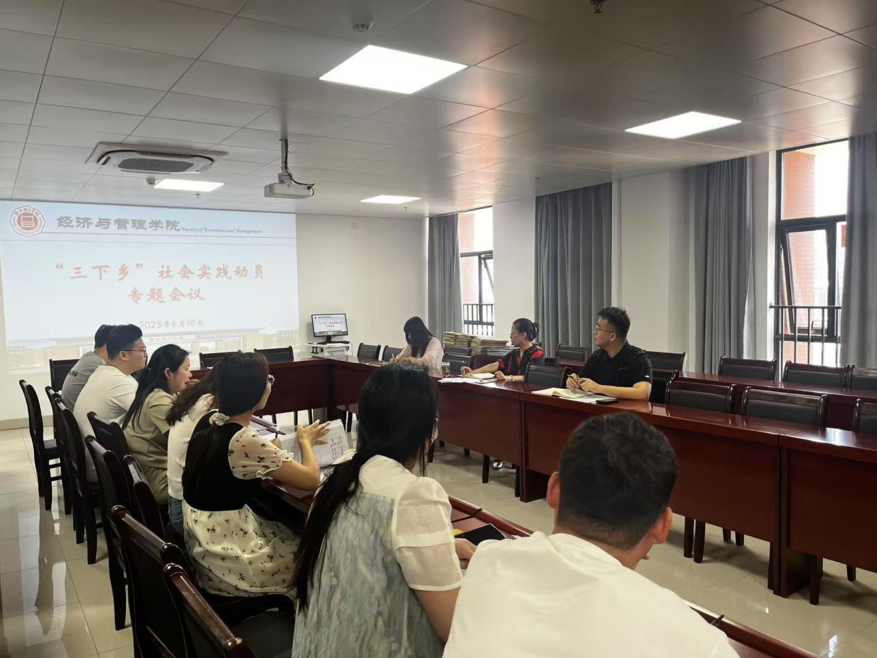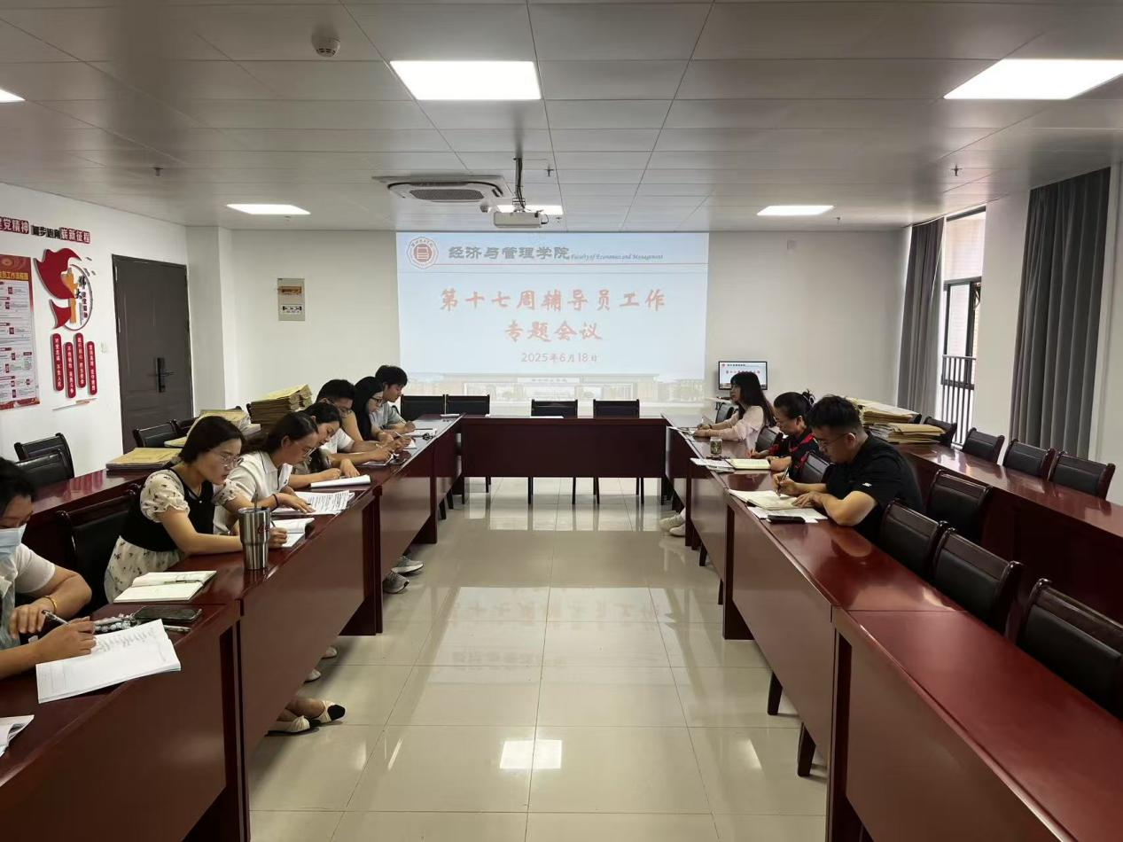 2025年6月17日,经济与管理学院在行政楼725会议室召开本学期第十七周学生管理工作例会暨暑期“三下乡”社会实践专题动员会议,学院书记助理员禹辛、团总支书记王绎程及全体辅导员参会,会议由院长吴玲主持。