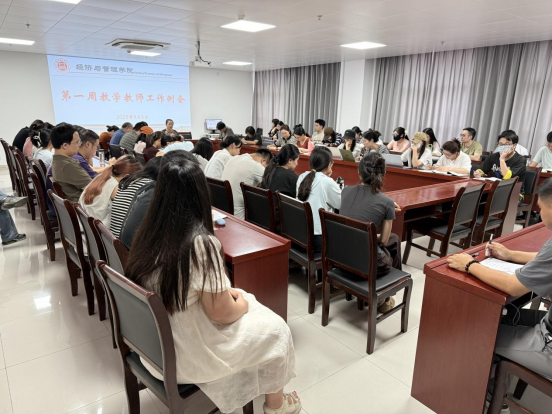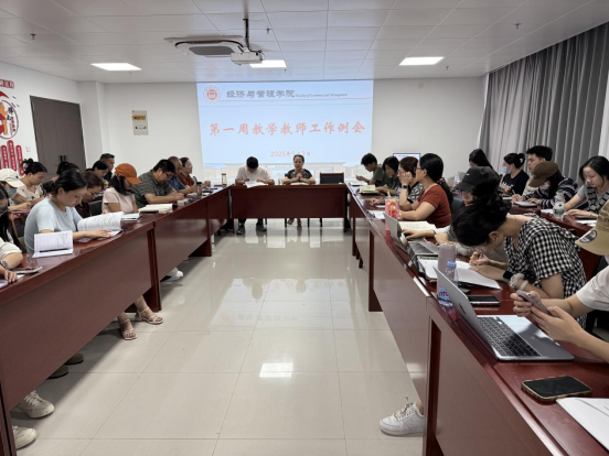 2025 年9月3日下午,经济与管理学院在行政楼725会议室召开第一周教学工作例会。院长吴玲,院长助理叶赵强及全体教师参会,会议由吴玲院长主持。