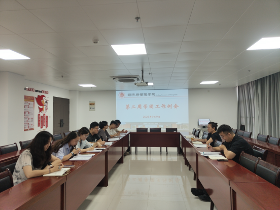 2025年9月9日,经济与管理学院于行政楼725会议室召开本学期第二周学团工作例会。学院书记助理员禹辛、团总支书记王绎程及全体辅导员参加会议,会议由院长吴玲主持。