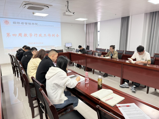 2025 年 9 月24日上午,经济与管理学院在行政楼725 会议室召开第四周教学行政工作例会。院长吴玲主持会议,院长助理张珊、叶赵强,教学秘书李健,各教研室主任及相关行政人员参会。