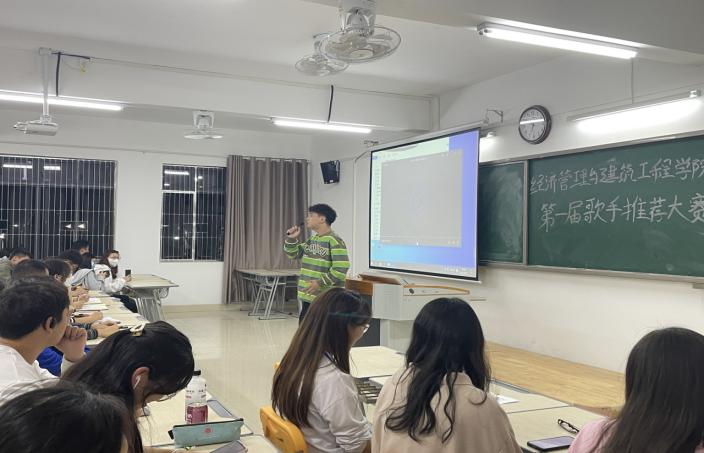为丰富同学们的校园生活,努力营造健康向上,积极进取的文化氛围;同时也为了积极响应学校关于举办“第一届校园歌手大赛”号召;经济管理与建筑工程学院于2022年9月27日下午6:30,在2教322、323开展了第一届校园歌手选拔赛,院教学秘书张珊、团总支负责人叶赵强、教师党支部书记刘路路、马克思主义学院教学秘书陈志操以及辅导员担任评委,本次比赛由2021级孙静婉、王俊燕两位同学担任本次选拔赛主持人。