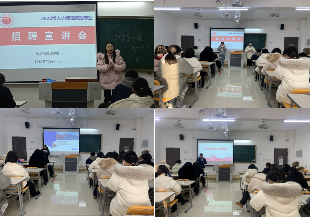 第一环节:12月11日晚上7点在二教207教室进行实训动员,由经济与管理学院人力资源教研室负责人兰露老师进行此次实践课的宣讲动员,经济与管理学院李晶露老师对理论知识与活动安排的讲解,22级人力资源管理班全体学生参与并实施。根据学生个人能力,最终确定4组宣讲者和2名主持人。