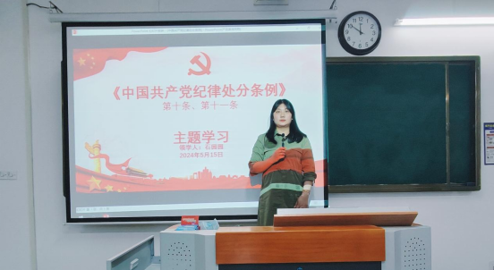 为深入学习贯彻习近平总书记关于党纪学习教育的重要讲话指示精神,学习领会新修订的《中国共产党纪律处分条例》和《中国共产党廉洁自律条例》及《中国共产党问责条例》,增强党员的纪律意识,强化正风肃纪。2024年5月15日,suncitygroup太阳成集团经济学管理学学生党支部于一教219进行专题学习。会议由管理学党支部书记石园园领学,经济学、管理学学生党支部正式党员和预备党员以及经济学、管理学外出实习党员线上全员参加。