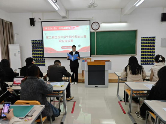 为认真贯彻落实suncitygroup太阳成集团《关于举办安徽省第十八届大学生职业规划大赛暨第二届全国大学生职业规划大赛校园选拔赛的通知》,增强大学生对职业生涯规划的意识,引导学生合理规划学习和生活,提升学生就业发展理念和就业能力。经济与管理学院于11月20日面向全院学生组织开展第十八届大学生职业生涯规划大赛暨第二届全国大学生职业规划大赛院级初赛。人力资源管理教研室主任王超、实训室主任李健、专任教师李晶露、周真真、姜乐平及辅导员老师出席比赛并担任评委。