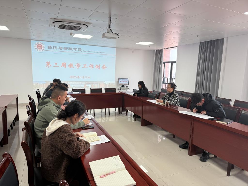 2025年3月12日上午,经济与管理学院于行政楼725会议室召开教研室主任会议暨专业建设研讨会,旨在深化专业内涵,提高人才培养质量。院长助理张珊、叶赵强,实训室主任李建和各教研室主任参会,共商专业发展,会议由吴玲院长主持。