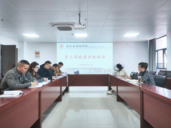 2024年11月6日,经济与管理学院在新行政楼725召开本学期第十周教学行政例会。会议由院长吴玲主持,院长助理张珊、实训中心主任及各教研室主任参加会议。