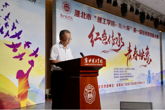杨兵校长在致辞中对淮北市人力资源与社会保障局为大赛提供的专业指导和资源支持以及安徽省六安瓜片茶业股份有限公司提供的赞助表示感谢。他指出,以“红色传承・青春映像”为主题的这场赛事,已经超越了单纯技能竞赛的界限。它不仅是一堂生动的思政课,更是一场青春与历史的深刻对话,也是学校实践育人体系结出的丰硕成果。他强调,学校将以此大赛为契机,将“红色光影育人”打造成为校园文化的一个品牌,激励更多师生在“理论学习、实践创作、传播分享”的循环中,用镜头捕捉时代的脉动,用影像传递力量。