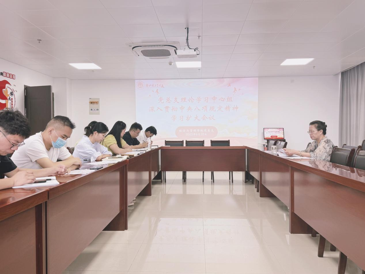 6月20日上午,经济与管理学院党总支于行政楼725党员活动室召开党总支理论学习中心组深入贯彻中央八项规定精神学习扩大会议。党总支书记吴玲主持会议,并以 “贯彻中央八项规定精神,共筑学院清风正气生态” 为题讲授主题教育专题党课,学院领导干部及党总支全体委员参会。
