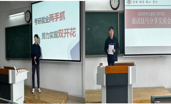 第二部分是由各专业在线下成功面试3家以上企业的学生分享交流,向本专业的学生分享面试注意事项与个人经验技巧;同时指出掌握专业知识对就业的关键作用,面试前应准备好包括英语证书、计算机证书、学校获奖证书、专业资格证书、兼职实习证明等等;还需收集求职公司的企业的排名、企业文化、核心业务等基本信息,了解清楚岗位需求以应对面试问题。在面试时,应该调整好心理状态,口齿清晰、语气平和地表达自己,适当地使用手势来表达观点。