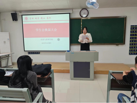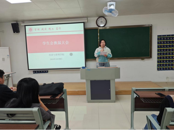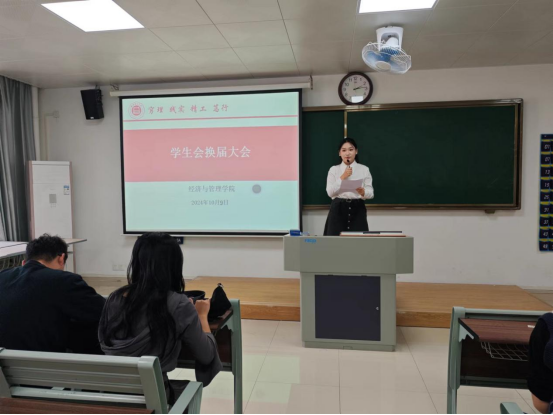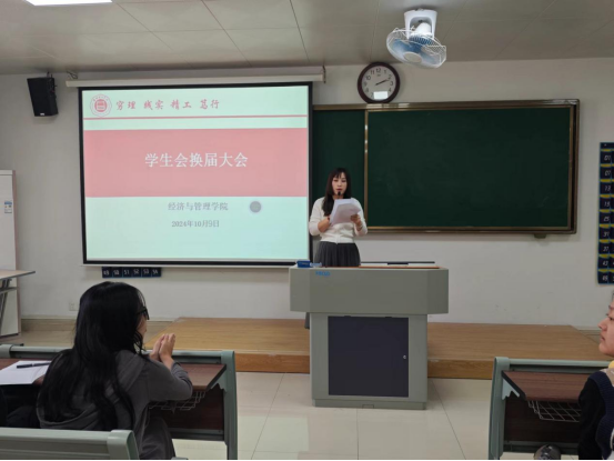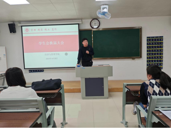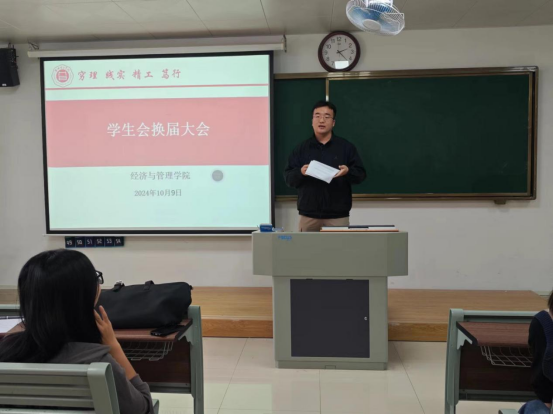 为给经济与管理学院注入新鲜血液新活力,进一步完善学生组织体系、优化队伍建设、提升学生干部的质量,于2024年10月9日下午2时在二教211教室举办2024年学生会换届大会暨学生会干部培训会议。经济与管理学院书记助理叶赵强,团总支书记员禹辛、辅导员以及新一届学生会35名成员参加本次换届大会。会议由团总支书记员禹辛主持。