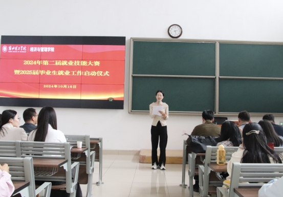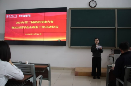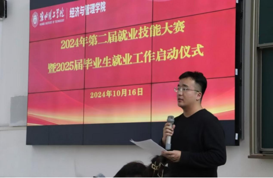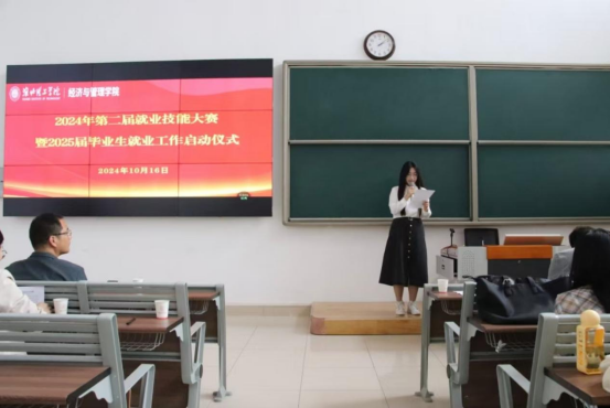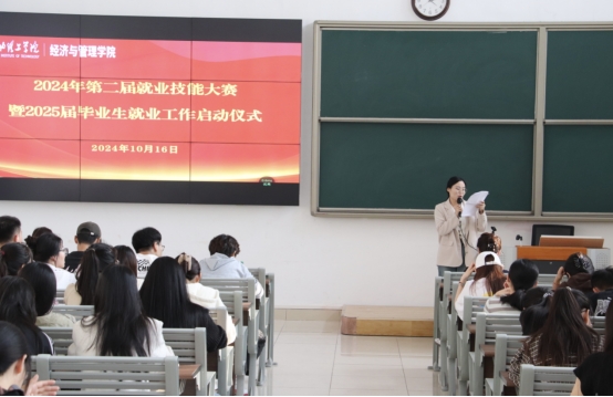 为进一步增强我院学生的就业竞争力,提升职业素养与实践能力,促进理论知识与就业市场的深度融合,经济与管理学院于10月16日下午在一教121开展“第二届就业技能大赛暨2025届毕业生就业实习工作、校企合作月启动仪式”。学院党总支书记、院长吴玲,书记助理叶赵强,各专业教研室主任、毕业班辅导员以及全体2025届600多名毕业生参加本次活动,处长助理李魏代表学生处(就业处)参加了启动仪式。本次活动分两场分别由郑凡和范红玲主持。